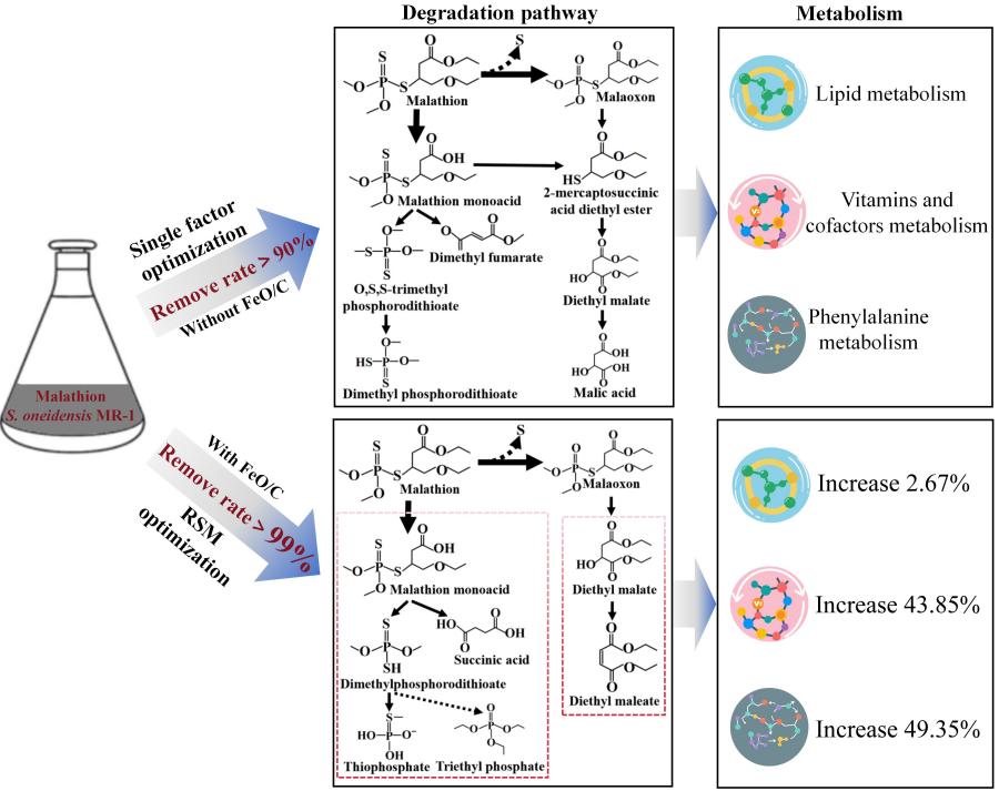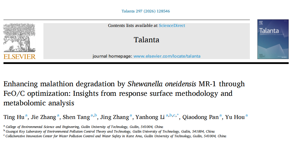 马拉硫磷作为广泛使用的有机磷农药,因难降解、易生物累积的特性,长期污染农田土壤与水体,传统化学修复易产生溴代或羟基化等有毒副产物,而单一微生物降解又受限于效率低、高浓度污染耐受差的瓶颈。近日,桂林理工大学李艳红研究团队在国际期刊《Talanta》(2026,297:128546)发表最新成果,通过铁氧化物-生物炭复合材料(FeO/C)优化奥奈达希瓦氏菌(S.oneidensisMR-1)的降解性能,结合响应面法(RSM)精准优化反应条件,并用代谢组学解析增效机制,在最优条件下实现马拉硫磷降解率提升至97.27%,且产物毒性显著降低,为有机磷农药污染修复提供高效、环保的技术方案。
