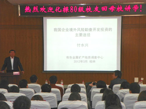 首先,由有色金属地质矿产调查中心副主任、北京矿产地质研究院副院长付水兴高级工程师为同学们做了题为《我国企业境外矿产勘查风险投资的主要途径》的专题报告。付水兴高级工程师上台为大家讲解了我国资源勘探现状,以及我国海外资源勘探的巨大前景,让大家兴奋不已。