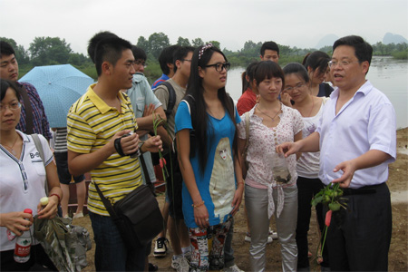 考察期间,吴志强副校长进行现场教学,介绍了会仙湿地的生态功能,物种及其多样性等方面的知识,并采集了一些典型物种如克氏原螯虾(小龙虾)、大瓶螺(福寿螺)及螺卵、和水葫芦等外来物种进行详细解析。他指出,这些外来物种均具有顽强的生命力,生长繁衍速度极快,竞争优势明显,从而威胁本地物种,破坏原有的生态平衡,使得湿地系统种群数量减少,物种的多样性受到影响。