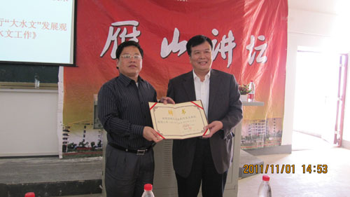 讲座开始前,学校在现场举行了简短而隆重的仪式,学校副校长吴志强教授代表学校给魏文达局长颁发了聘书,聘请他为桂林理工大学客座教授。