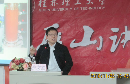 11月26日下午4:30,张文杰博士在雁山校区05311教室给我院2010级学子作了题为“日本环境治理技术进展”的专题报告。此次“雁山讲坛”报告会由学院团委书记刘志丽老师主持。