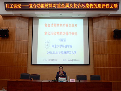 在母校六十华诞到来之际,应我院邀请,1995级校友、南京大学博士生导师刘福强教授在雁山校区萃华楼一楼的广西矿冶实验中心报告厅做了题为“复合功能材料对重金属及复合污染物的选择性去除”的学术报告会,相关专业的师生100人参加会议。