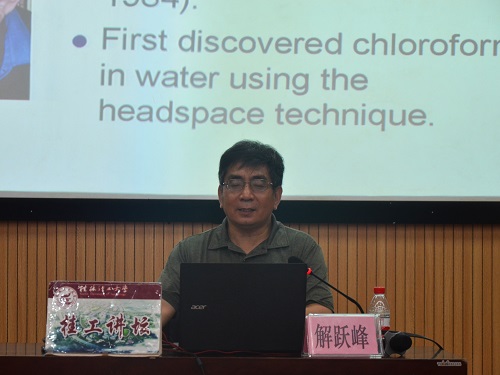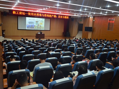 7月6日上午,应环境科学与工程学院邀请,美国宾州州立大学首府学院环境工程教授、建设部水专项咨询专家和美国联邦环保署饮用水咨询专家解跃峰教授做客桂工讲坛,在雁山校区图书馆报告厅作了题为《饮用水消毒与消毒副产物:历史与现状》的报告。我院200余名师生聆听了本次讲座,报告由学院常务副院长游少鸿主持。