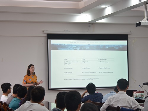 史良胜教授在讲座中分别介绍了基于复杂物理机制的数据同化模型、一定物理机制和大量数据的回归模型以及无物理机制、基于高分辨率图像的深度学习模型进行南方糖料蔗和水稻的作物生长过程模拟及产量估计方面的研究进展,并积极与学生交流互动,启发同学们思考。Sophie博士用英语讲述了爱丁堡大学开发的森林生态系统碳循环SPA模型在亚马逊地区不同降水梯度下的碳循环及叶面积指数(LAI)空间变化模拟等方面的研究情况。