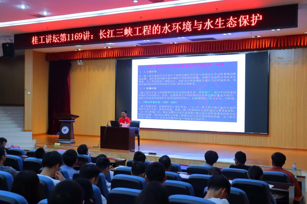2020年10月29日,应我院邀请,中国水利水电科学研究院水电可持续发展研究中心主任黄真理教授,在我校雁山校区图书馆报告厅作了题为“长江三峡工程的水环境与水生态保护”的学术报告。报告会由学校党委副书记吴志强主持,环境科学与工程学院副院长李艳红、各教研室教师和硕士研究生学生代表共200余人参加了本场讲座。