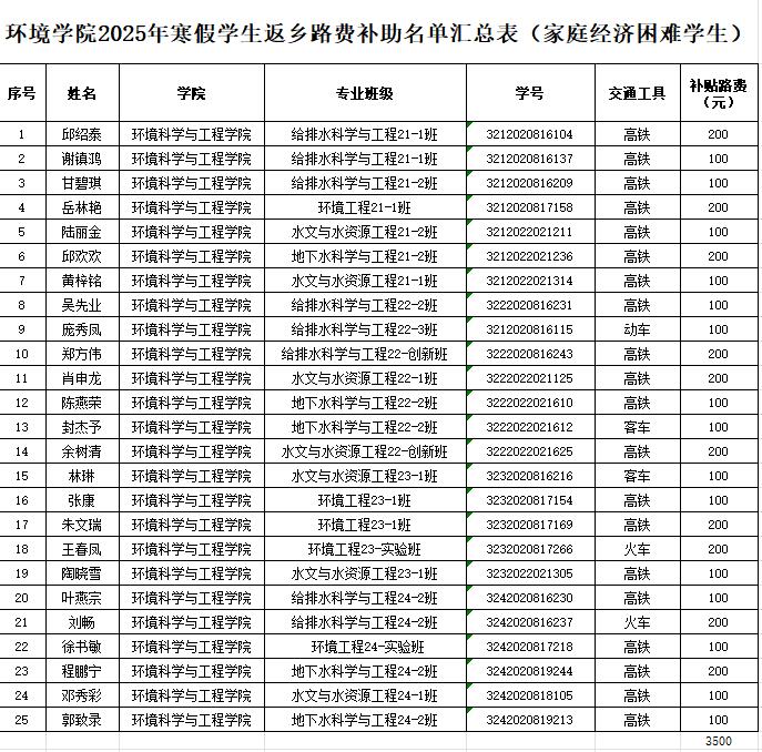 根据学校及学院相关要求,在学生自愿申请的基础上,经学院学生工作领导小组审核,现将我院2025年寒假家庭经济困难学生返乡路费补助推荐名单公示。