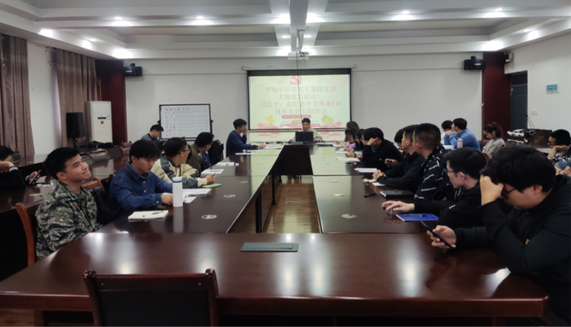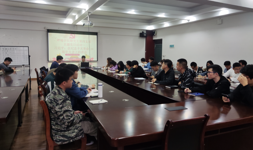 10月20日下午15时,我院研究生第四党支部在12407会议室开展“学习习近平总书记在纪念辛亥革命110周年大会上的讲话”主题党日活动,全体党员参加会议,本次会议由支部副书记石谦主持开展。
