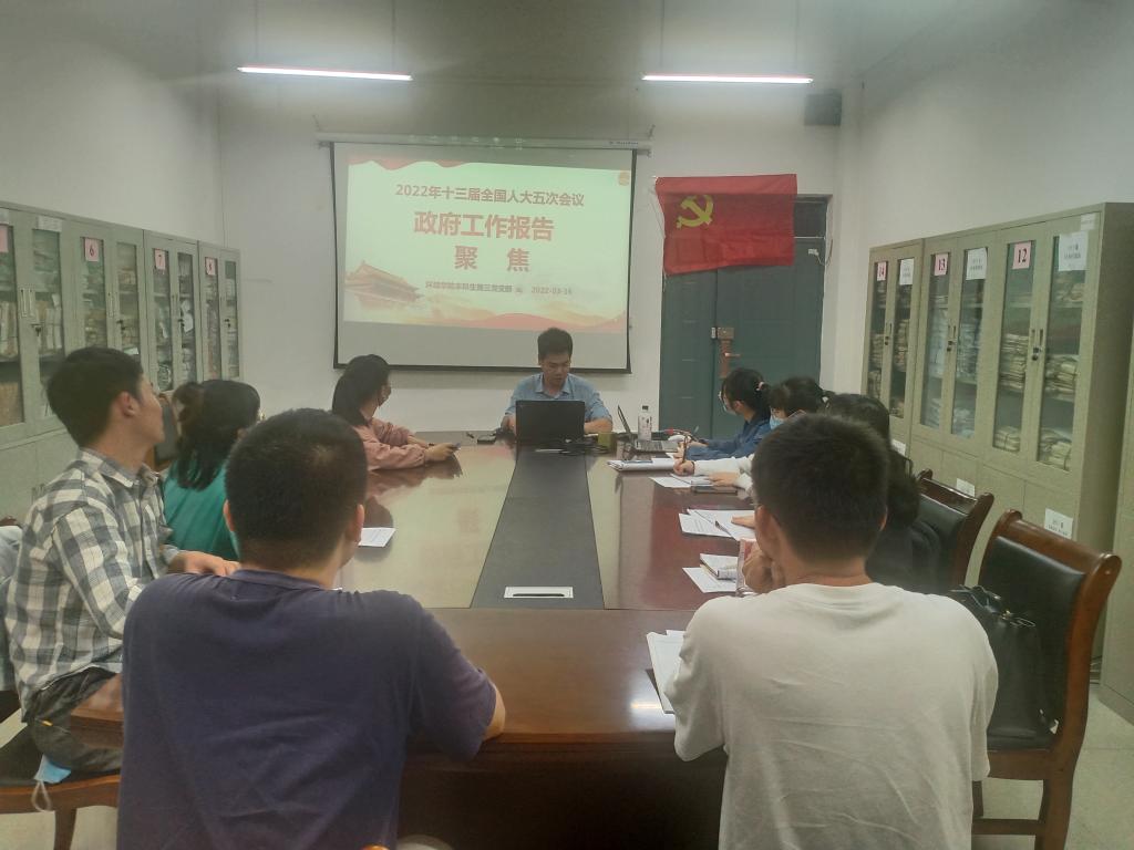 2022年3月16日,环境科学与工程学院本科生第三党支部于12415开展“学习十三届全国人大五次会议政府工作报告”主题党课,会议由支部副书记韦春伊同志主持,支部书记孙云龙老师及支部全体党员参加本次会议。