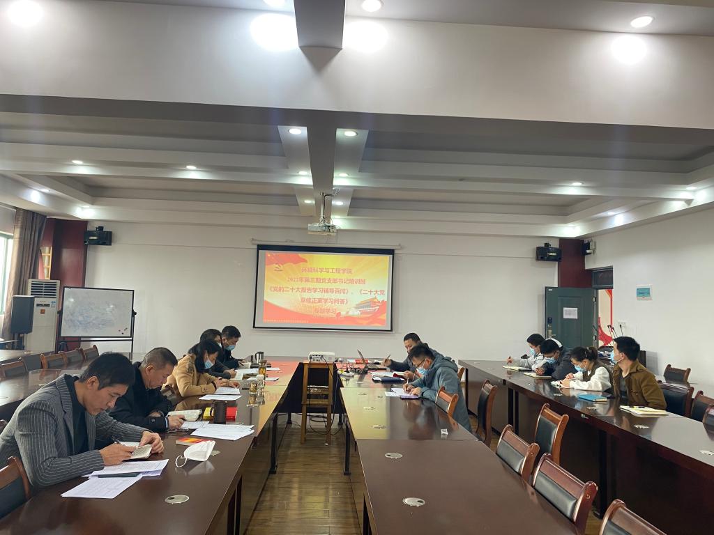 2022年12月5日,我院在雁山校区萃华楼12407会议室召开2022年党支部书记培训班第三期:《党的二十大报告辅助百问》、《二十大党章修正学习问答》专题学习,学院全体党支部书记参加,学习会由学院党委书记姜子亮主持。