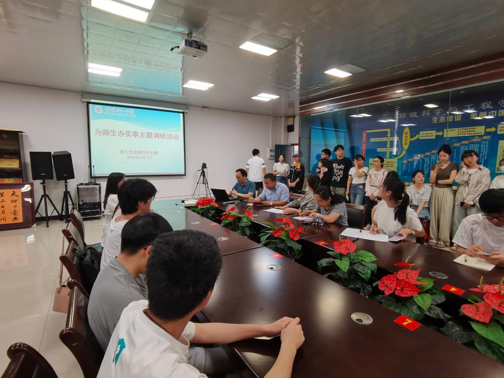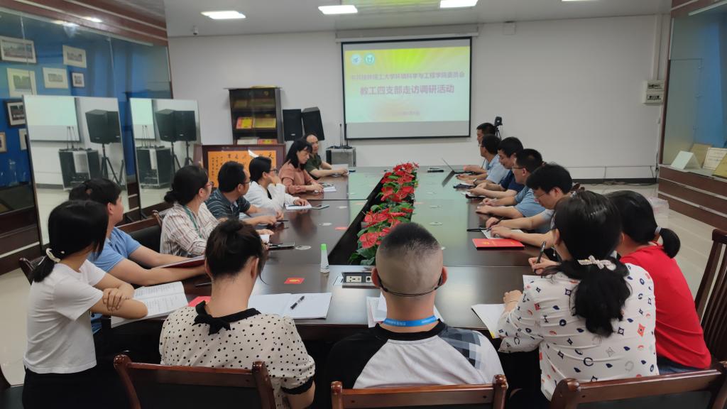 为深入学习贯彻习近平新时代中国特色社会主义思想,坚持以习近平新时代中国特色社会主义思想的科学体系为指导,中共桂林理工大学环境科学与工程学院党委教工第四党支部于6月6日-7日在全院范围内开展主题教育活动:为师生办实事走访调研。本次走访调研活动由学院党委委员李艳红、朱宗强主持,党支部书记梁延鹏及实验室、教研室相关教师、研究生参加本次走访调研活动。