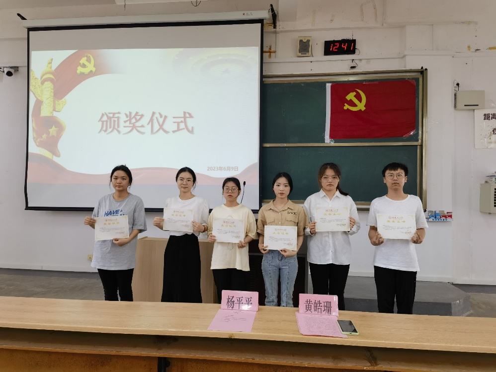 典礼开始,首先全体成员起立,奏唱国歌。其次,由优秀学员代表李湘发言,她表示发展对象们应该树立正确的入党动机,拥有持久不衰的动力,刻苦学习。同时要把对共产主义事业的忠诚同执行党的基本路线统一起来,在改革开放和现代化建设中积极做出贡献。随后,由我院党建组织员、党建办公室主任杨平平老师作结业总结,他总结了培训成效,同时希望和要求发展对象要树立坚定理想信念,提高自身党性修养,确定终身学习理念,提高自身综合素养,注重理论联系实际,提高自身工作能力,在工作上创佳绩、争先进、做表率,以优异成绩接受党组织的考验。最后,由杨平平、黄皓珊老师对优秀学员进行颁奖。