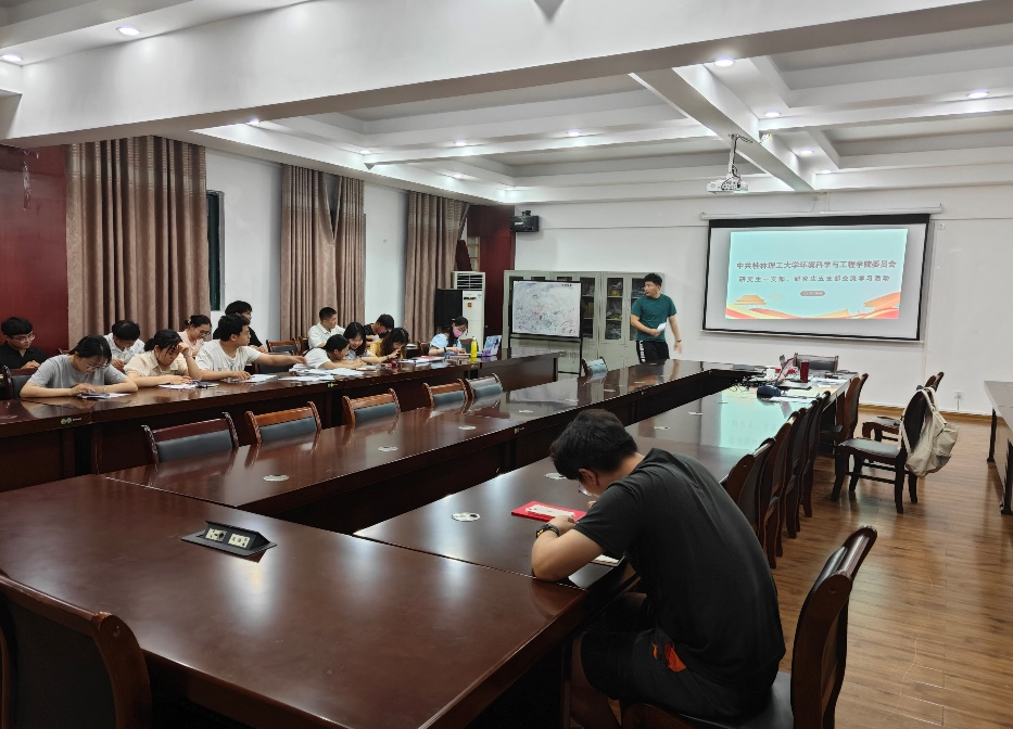 晚上7点,研一支部与研五支部相聚于12栋教学楼407会议室,首先,研一支部代表李珉同志结合PPT分享学习经验;随后,两支部就习近平新时代中国特色社会主义思想进行了探讨;最后,由研五支部学生代表李碧媛同志进行总结。