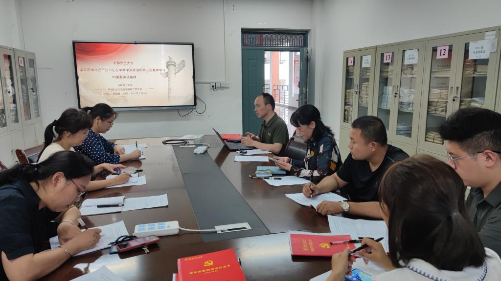 为学习贯彻习近平新时代中国特色社会主义思想主题教育工作会议的精神,领悟习近平总书记在中共中央政治局第五次集体学习时重要讲话,7月6日上午,我院教工四支部于雁山校区12415召开党支部大会:学习贯彻习近平总书记在中共中央政治局第五次集体学习时重要讲话精神,本次学习会由支部书记梁延鹏主持,全体支部党员教师参与。在会议过程中,党支部同志对学习内容进行了讨论,并相互分享了学习心得。
