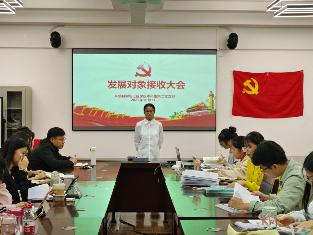 2023年10月10日,环境科学与工程学院本科生第二党支部于12407会议室召开积极分子转发展对象答辩会。本次会议由支部副书记黄涓同志主持,支部书记唐源江同志、支部全体党员、预备党员及答辩的积极分子参加本次会议。