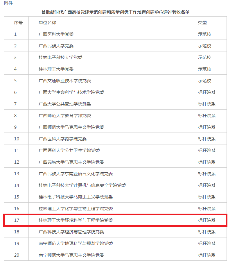 近日,自治区党委教育工委下发《关于公布首批新时代广西高校党建示范创建和质量创优工作培育创建单位验收通过名单的通知》,环境科学与工程学院党委顺利通过首批新时代广西高校党建示范创建和质量创优工作验收。