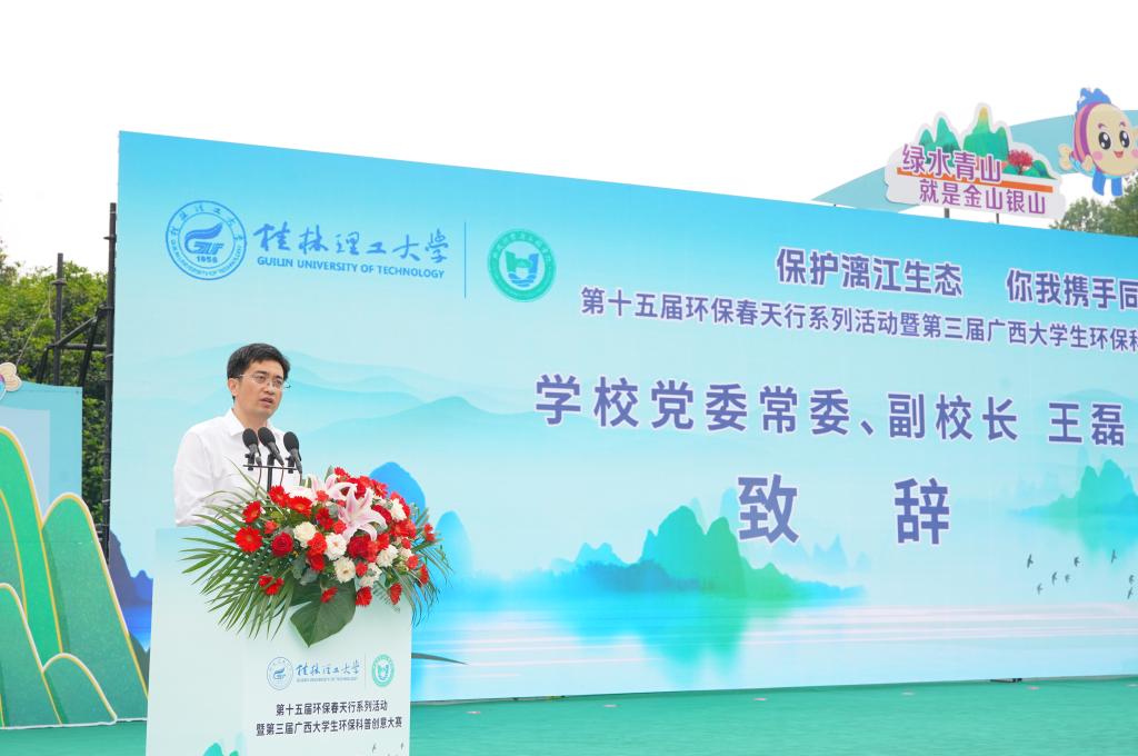 王磊在致辞中向各位嘉宾朋友、老师和同学们表示热烈欢迎。他指出,党的十八大以来,习近平总书记围绕生态环境保护和生态文明建设提出了一系列新理念新思想新战略,把“生态文明建设”纳入“五位一体”总体布局,把“人与自然和谐共生”纳入新时代坚持和发展中国特色社会主义基本方略,把“污染防治”纳入三大攻坚战。他强调,学校将把环保春天行系列活动打造成人才培养的新阵地、服务百姓的新平台、引领生态文明实践的新品牌,进一步增强学校和社会的深度融合发展,保护好漓江、保护好桂林山水,有效提升学校服务能力和百姓生活质量,为谱写中国式现代化广西篇章贡献新的更大力量。