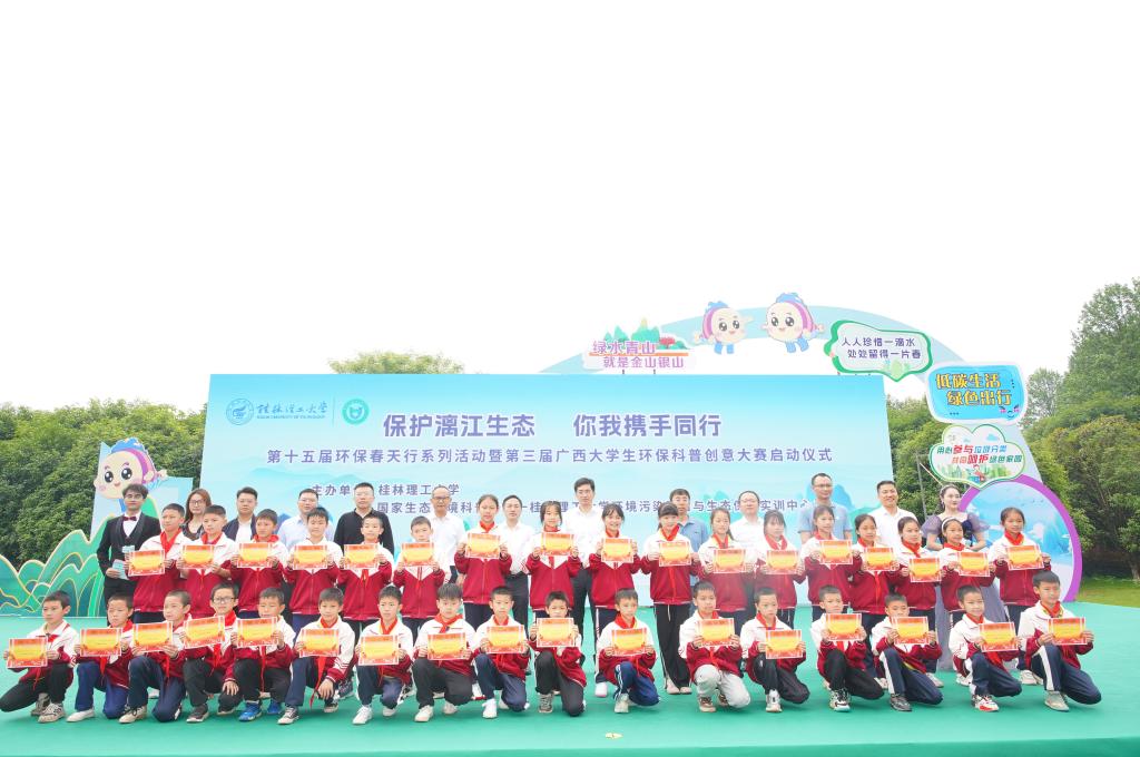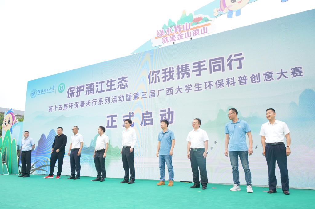 4月25日上午,在第三个桂林市“漓江保护日”到来之际,为深入贯彻落实习近平生态文明思想,提升广大青年学生环保意识,展现当代青年的环保担当与青春风采,由学校和国家生态环境科普基地—桂林理工大学环境污染防治与生态保护实训中心主办的“保护漓江生态,你我携手同行”第十五届环保春天行系列活动暨第三届广西大学生环保科普创意大赛启动仪式在雁山校区举行。学校党委常委、副校长王磊出席活动并致辞,党委常委、宣传部部长叶昊,校长助理、党办校办法务办主任张成龙,广西环境科学学会秘书长王晓飞,桂林市生态环境局、兴安县生态环境局有关领导,各兄弟院校相关领导和嘉宾、学校相关职能部门负责人出席活动,广西大学生环保科普创意大赛参赛代表以及桂林市大埠中心校师生代表参加活动。