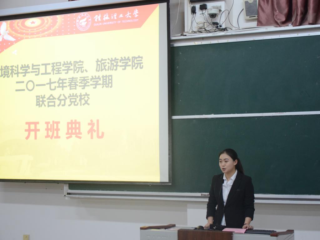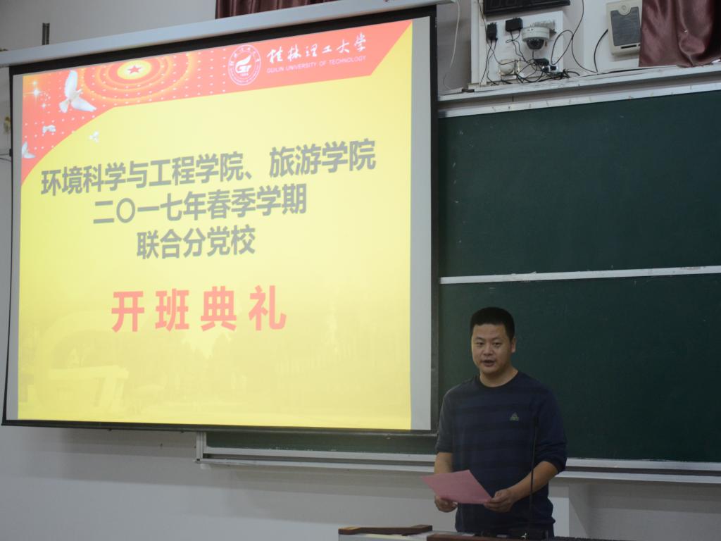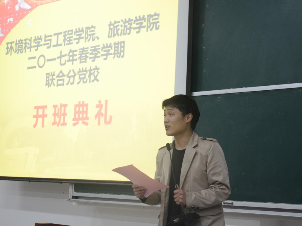 2017年4月8日晚,环境科学与工程学院、旅游学院在雁山校区05314教室联合举行了“环境科学与工程学院与旅游学院联合分党校积极分子培训班”开班典礼。我院党委书记王璐老师、旅游学院团委书记李少华老师以及我院16级辅导员田明浩老师分别出席了本次典礼,本次典礼由田明浩老师主持。