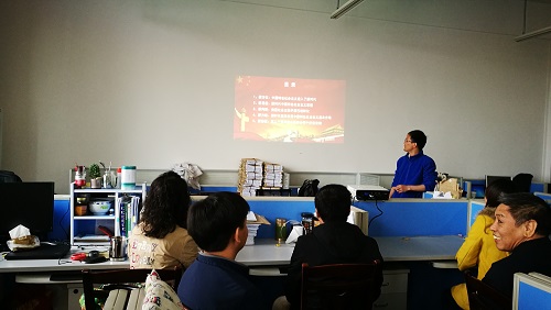 本次党支部会议的主题为“学习解读党的十九大精神——新方位、新思想、新判断、新方略、新部署”。在会上覃礼堂以ppt的形式从五个方面学习习近平总书记党的十九大报告重要精神:1、新方位:中国特色社会主义进入了新时代;2、新思想:习近平新时代中国特色社会主义思想;3、新判断:我国社会主要矛盾已经转化;4、新方略:新时代坚持发展中国特色社会主义基本方略;5、新部署:第二个百年奋斗目标分两个阶段安排。