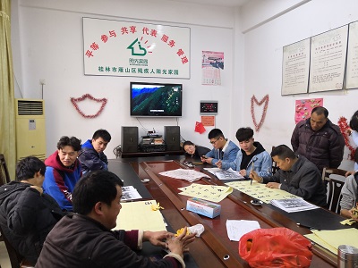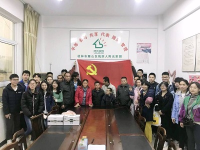 “弘扬雷锋精神,争做雷锋传人”是我院党员发展培养工作中的重要组成部分,为加强新时代下入党积极分子及党员同志的党性修养,帮助同学们继承党的优良传统,弘扬雷锋精神,进一步对党以及先进模范人物进行深入了解。我院于2019年3月19日组织各支部入党积极分子及党员代表前往桂林市雁山区残疾人阳光家园开展关爱、慰问残疾人活动,本次活动由学院党建办主办,旨在让积极分子和党员同志在活动中学习到助人为乐,勇于奉献的雷锋精神;活动开展前,细心的同学们为他们提前准备了牛奶以及水果;下午2点50分,大家准时到达了活动地点,在阳光家园工作人员的热情引导下,同学们进一步了解到他们的生活状况;主要了解了他们生活、健康、出行、娱乐等方面的需求;期间,热心的同学们为他们剥水果,陪他们练习书法、下象棋、唱歌等;帮助部分残疾人完成饰品的制作。活动最后,大家聚集在一起合影留念。