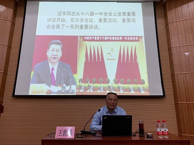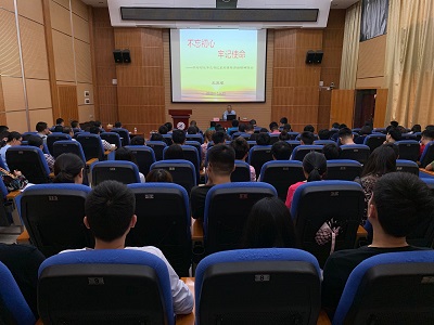 为贯彻党的“三会一课”指导思想,深入学习贯彻习近平新时代中国特色社会主义思想和十九大精神,2019年5月22日下午,学校党委常委、副校长王敦球同志应邀为我院师生党员主讲“不忘初心、牢记使命”专题党课,我院全体党员教师和部分学生党员代表参加党课学习,党课由学院党委书记姜子亮主持。