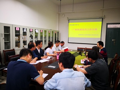 3月12日下午,环境学院教工四支部依据“两学一做”学习教育常态化制度化要求,在雁山12415召开了《广西发展党员工作手册》集中理论学习会,学习会由支部书记梁延鹏主持。