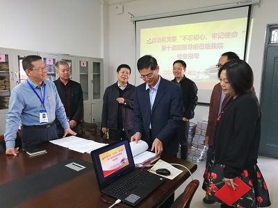 10月31日上午,自治区党委“不忘初心、牢记使命”主题教育第十巡回指导组副组长何并文、组员黄弢、龙振奕一行到我院检查指导“不忘初心、牢记使命”主题教育工作。校党委常委、组织部部长邓国彬等组织部领导与我院党委书记姜子亮、常务副院长(正处长级)曾鸿鹄、支部书记覃礼堂参加。