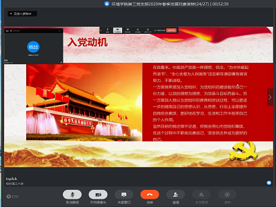 首先,由会议主持人张广禄同志宣读线上会议相关注意事项后,正式宣布大会开始。会上,参加发展对象答辩的6名积极分子通过演示文档和个人阐述,向支部成员阐述了自己对党的认识和入党动机,并对自己近期的学习、生活和思想建设等方面进行了分享,有的同学还就并如何发挥个人所长,实现个人价值的同时奉献社会等多方面分享了自己的思考和体会,值得一提的是,6名演讲者在演讲过程中都有提到疫情暴发期间的所思所想。