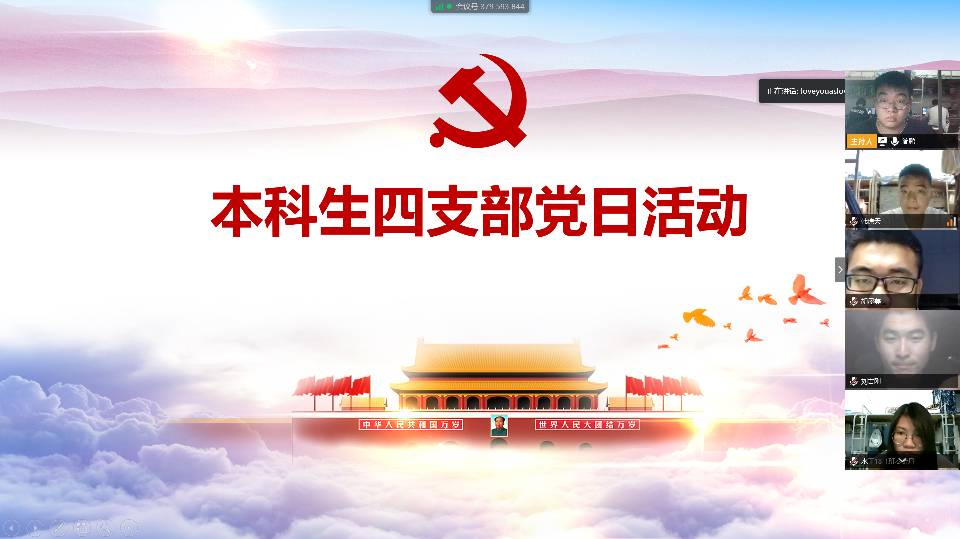 目前,新冠疫情防控依然不能松懈,我院本科生第四党支部为进一步贯彻学院党委精神,利用腾讯会议开展主题党日活动,充分发挥党组织的凝聚力,传导先进正能量,为疫情防控营造浓厚氛围。支部于2020年4月30日晚19:00利用腾讯会议召开线上主题党日活动。支部副书记简鹏同志主持会议,全体支部党员和发展对象参加会议。