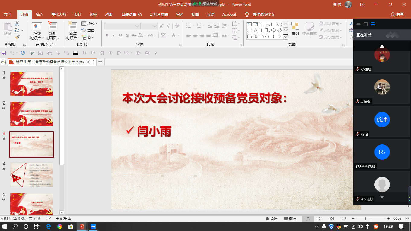 大会围绕接收闫小雨发展对象成为预备党员,并通过大会讨论并决定发展对象的入党问题。