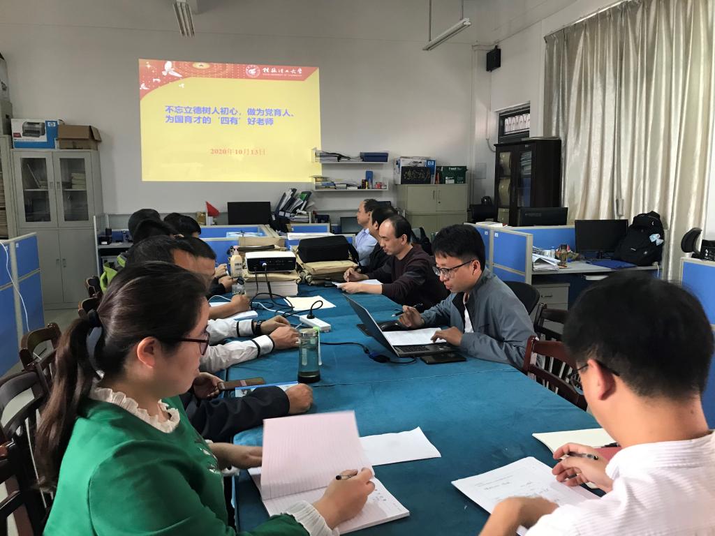 2020年10月13日下午,我院水文与水资源工程教研室在雁山12416办公室召开关于深入学习贯彻习近平总书记重要文章《思政课是落实立德树人根本任务的关键课程》的专题学习及“不忘立德树人初心,做为党育人、为国育才的‘四有’好老师”的交流会。会议由教研室主任张帅普老师主持,教研室全体教师参加了本次会议。