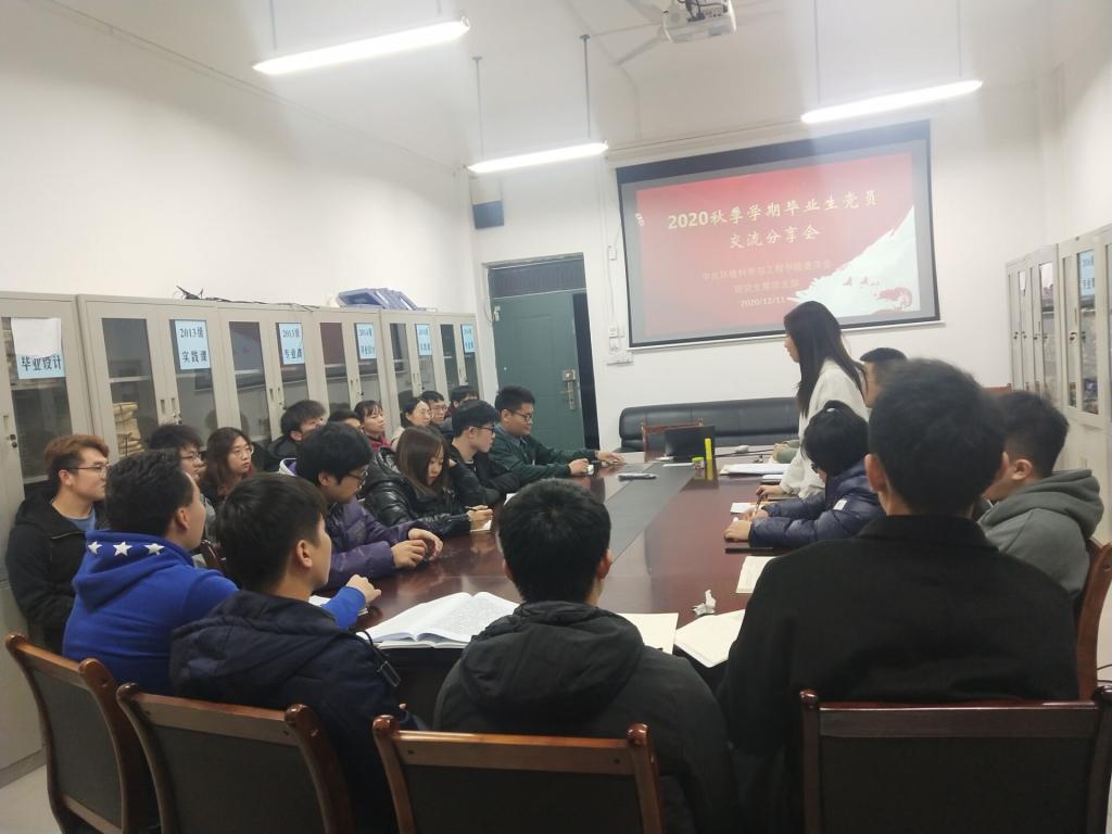 12月11日,我院研究生第四支部在雁山校区12414会议室召开2020年秋季学期毕业生党员交流分享会,由2018级硕士研究生廖丹雪同志、陈辉同志向其低年级党员同志分享他们研究生成长经历和感悟,会议由党支部副书记刘允全(2020级硕士研究生)同志主持。