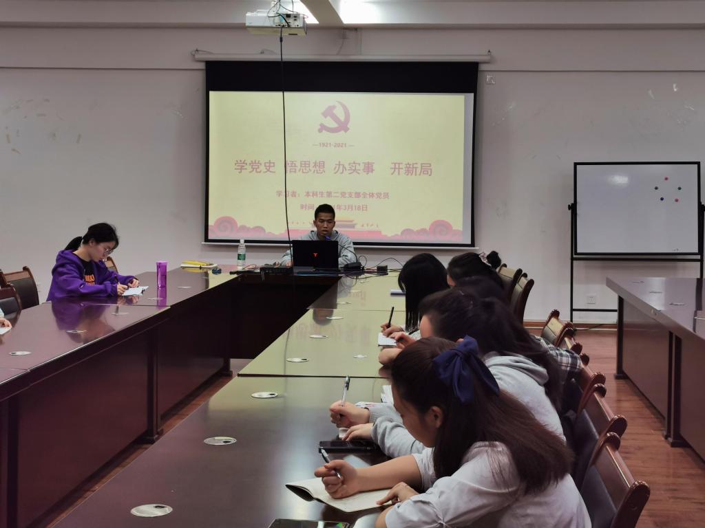 2021年3月18日晚,环境科学与工程学院本科生第二党支部在12407开展党史学习教育,支部党员参加会议,会议由支部副书记杨智钧同志主持。