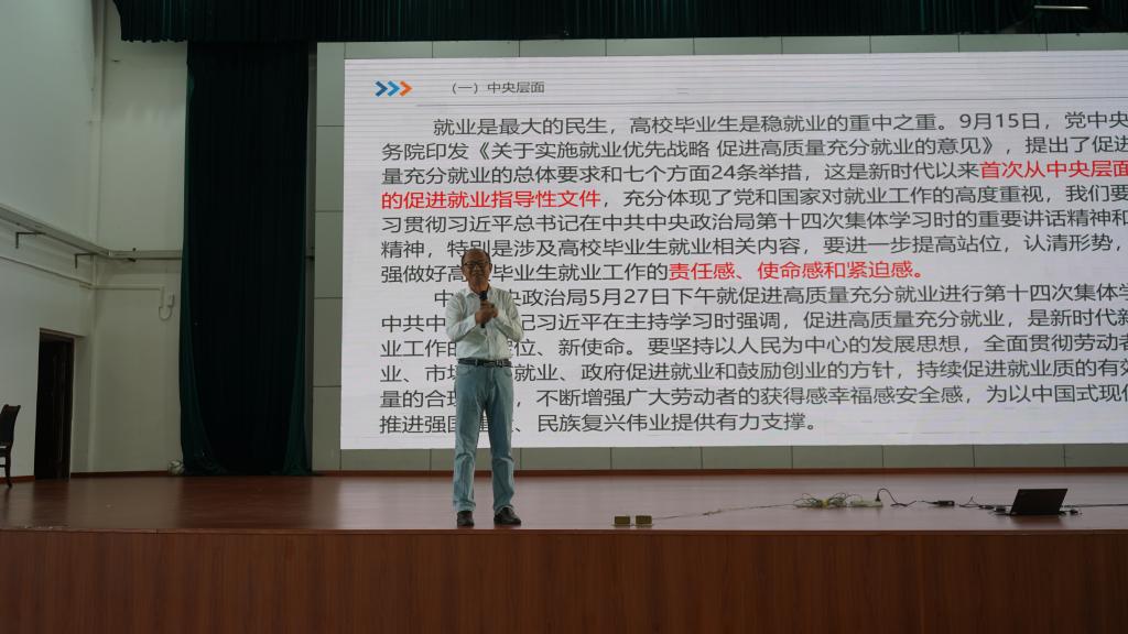 随后,迟国东作题为“解读政策,实现毕业生高质量就业”的专题报告,从学习有关就业工作的决策与部署、学校的就业工作概况、科学研判就业形势、实现毕业生高质量充分就业等方面内容帮助同学们了解就业动态和趋势,引导学生树立积极的就业心态,提前做好应聘准备,从容应对各项挑战。